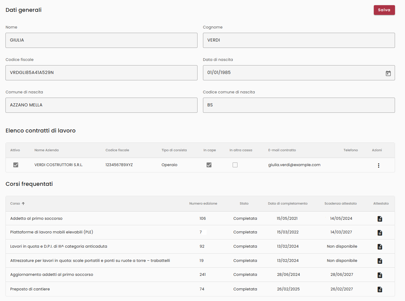 Ogni utente ha accesso al proprio storico formativo completo, con la possibilità di scaricare direttamente gli attestati e monitorare le date di scadenza delle certificazioni.