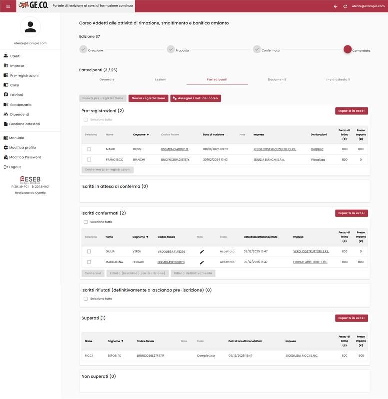 La pagina edizione è il centro operativo del sistema: dall'iscrizione alla partecipazione, fino alla generazione automatica degli attestati e della documentazione necessaria.