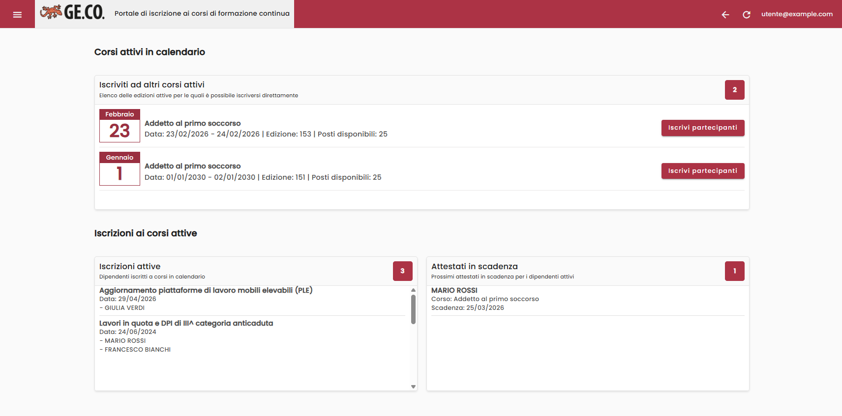 L’homepage utente è il pannello di controllo dell'impresa che ha il programma dei corsi in calendario e può procedere con le iscrizioni in autonomia, monitorare i corsi in calendario e verificare le scadenze in tempo reale.